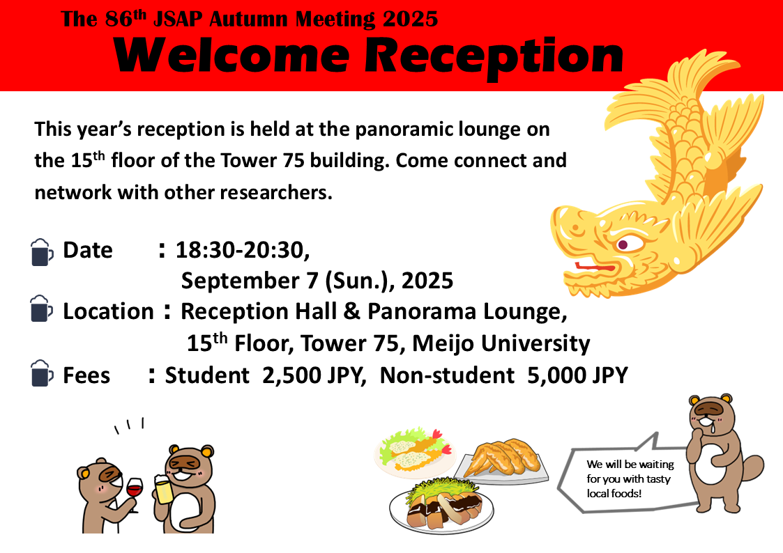 | Venue | Reception Hall & Panorama Lougnge, 15th Floor of Tower 75 Bldg., Tempaku Campus, Meijo University |
