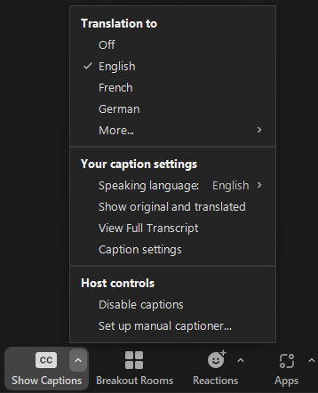 Notes:The following or later versions of Zoom will be required to show translated captions.