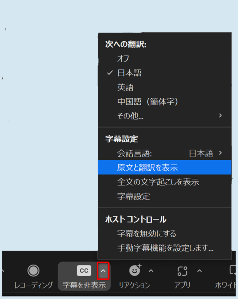 字幕の表示・非表示、翻訳言語の切り替えは参加者にて設定いただけます。操作方法は以下をご参照ください。